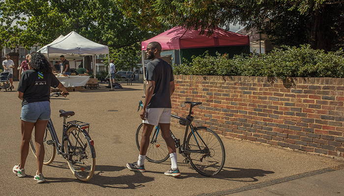 Two people walking their bicycles through a market in London.