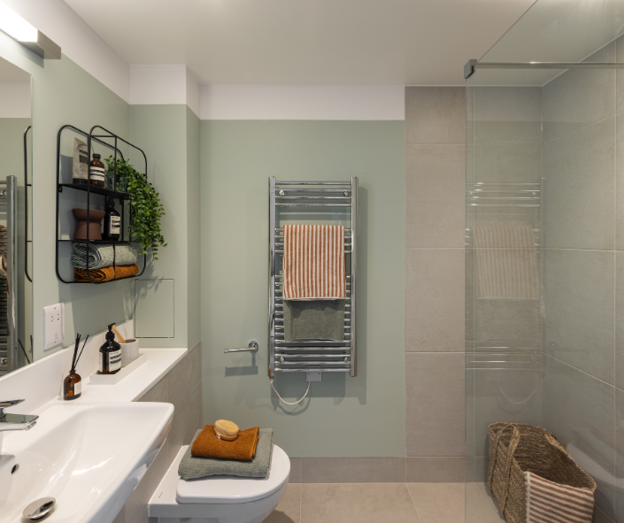 At Woodside Park N12, the wet rooms were manufactured as a pod off site: a controlled factory environment for production means reduced embodied carbon as it creates less waste and fewer deliveries to a building site (bathrooms are otherwise complex and require a variety of trades to be on site, such as plumbers, plasterers, tilers etc.). In addition, the Corian vanity top in the wet rooms are hygienic, renewable and repairable, reducing the need for new materials and harsh chemical products. EcoSmart shower technology means that 60% less water is required than conventional shower products.